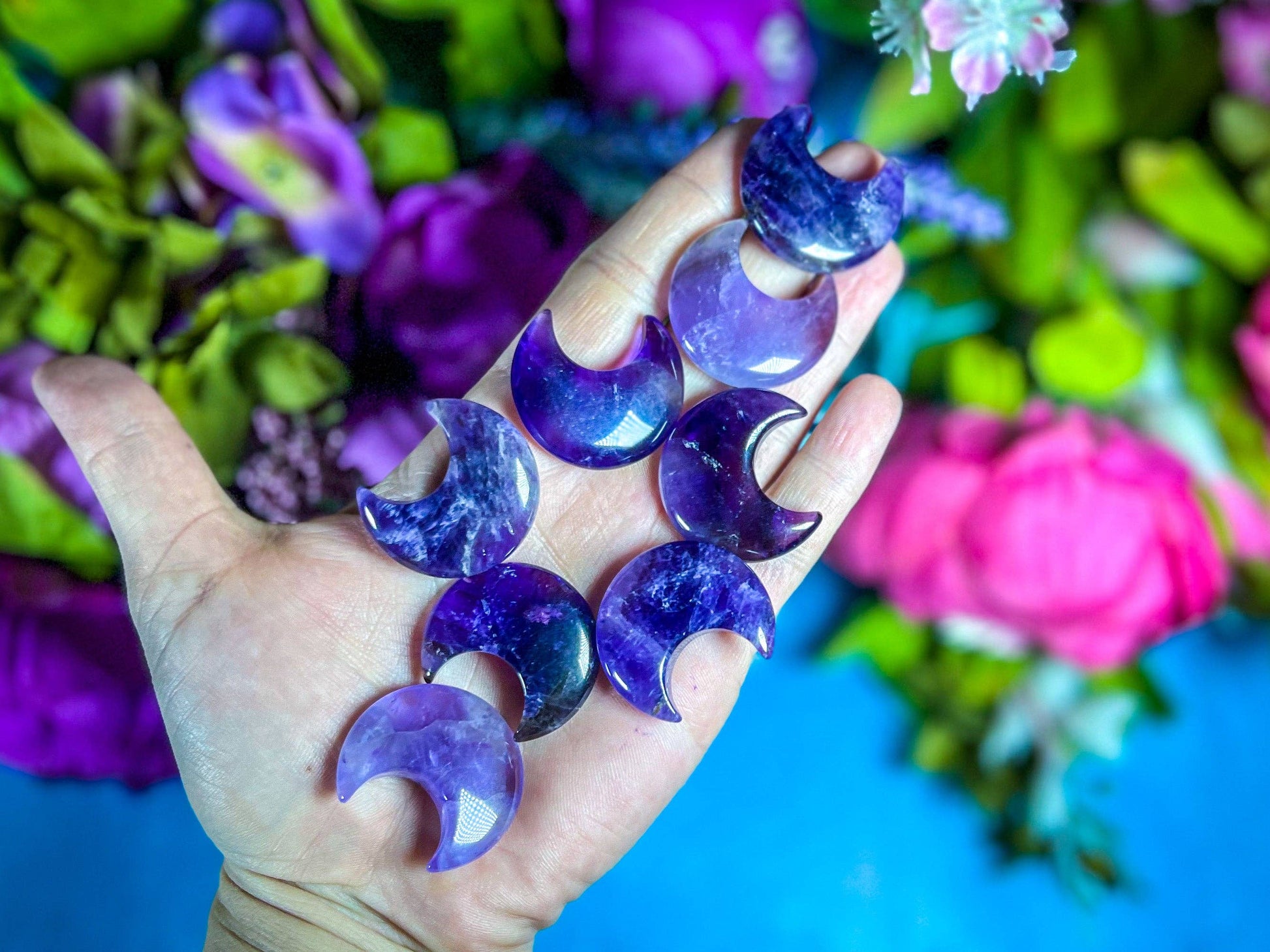 These dreamy amethyst crescent moons are 30 mm in size. This beautiful crescent moon is crafted from a natural amethyst gemstone, and it carries with it incredible properties that can help transform your life. Amethyst can aid you in peace, protection, and clarity of the mind so that you can enjoy life in a greater capacity. It's a natural tranquilizer that relieves stress, soothes irritability, balances mood swings, and dissolves any feelings of anger or sadness.