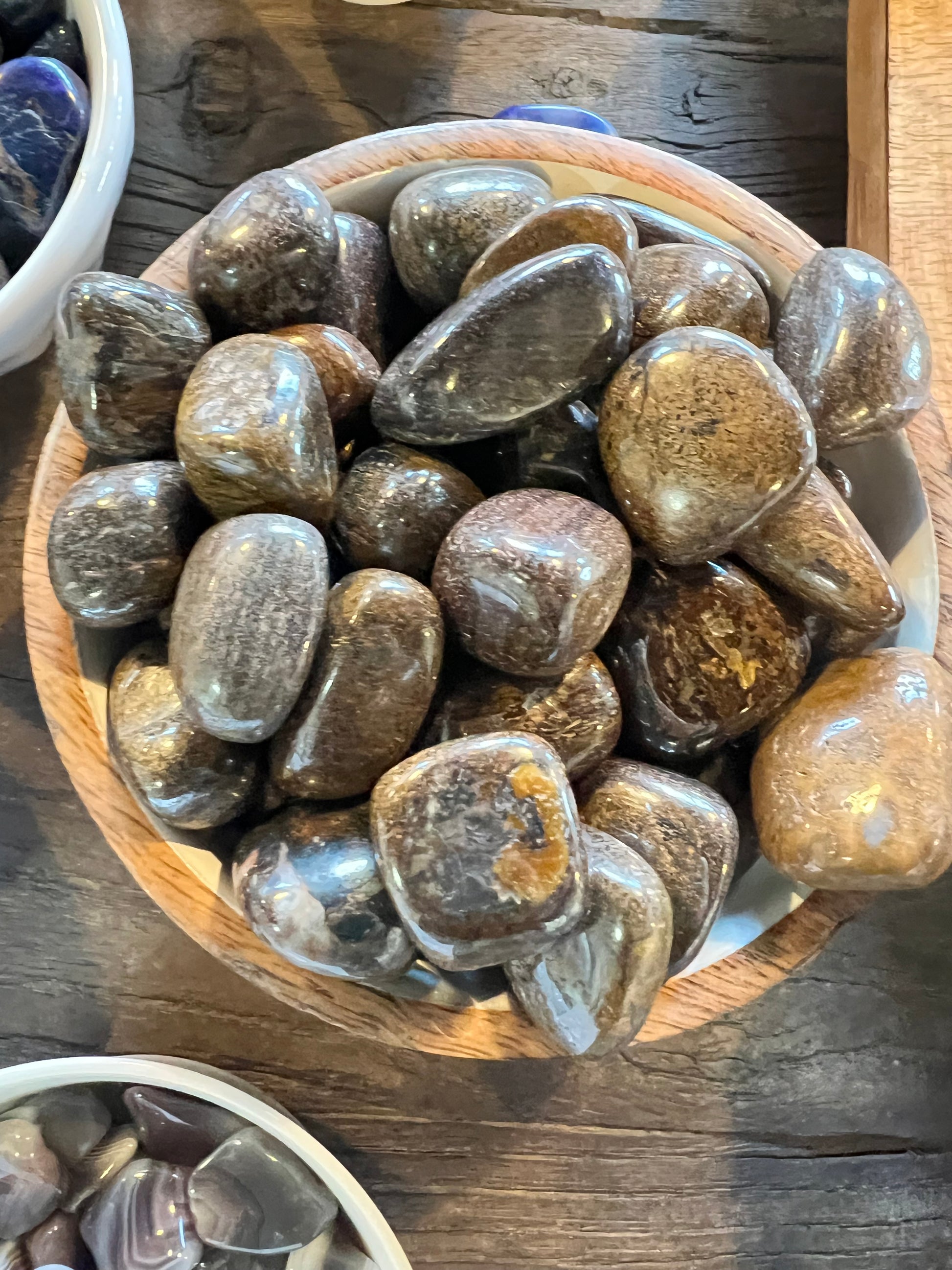 Bronzite is deeply grounding, helping to alleviate nervousness or anxiety in new situations. It promotes mental clarity and certainty of thinking and actions. It helps to improve self-esteem and decision-making, dispels negativity, and enhances creativity. Bronzite can be used to help folks who work in service industries, as it brings not only calm but a sense of courtesy toward others. It is a versatile stone that can be used to support every chakra, but it resonates the most strongly with the lower three (root, sacrum, and solar plexus).