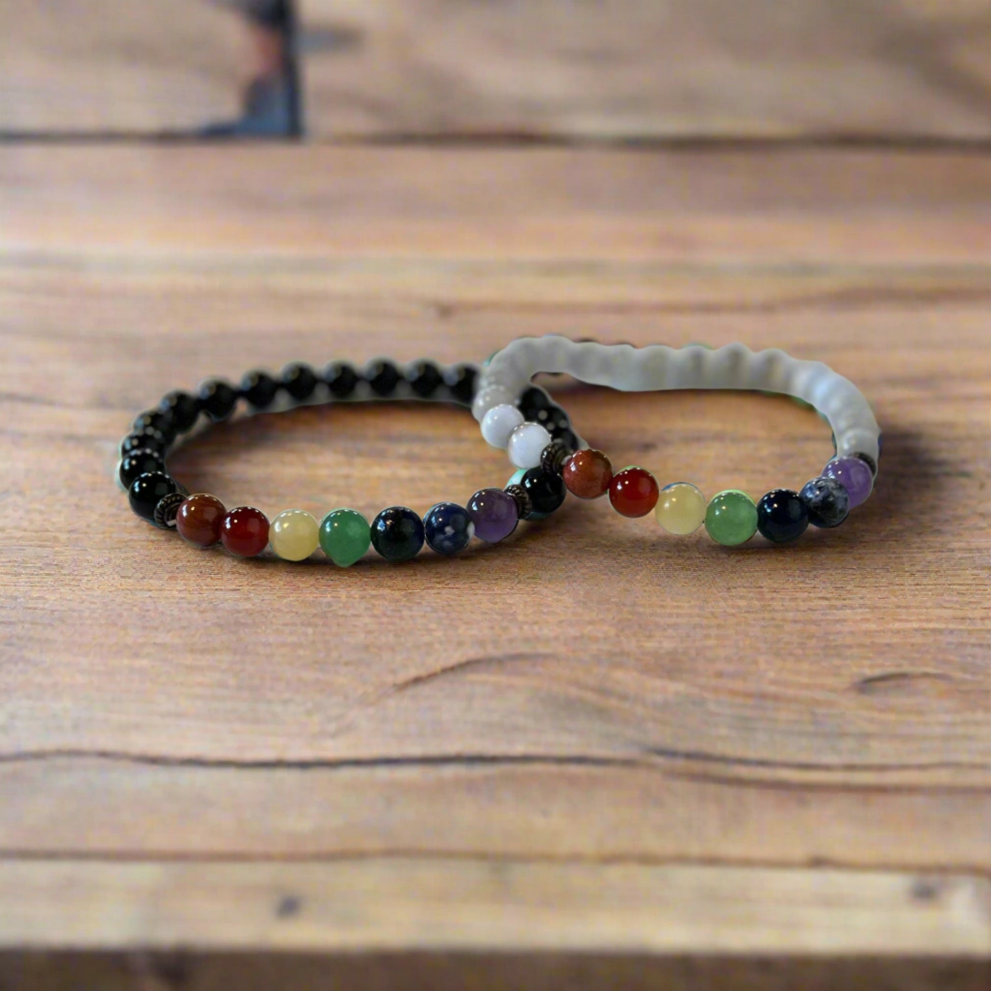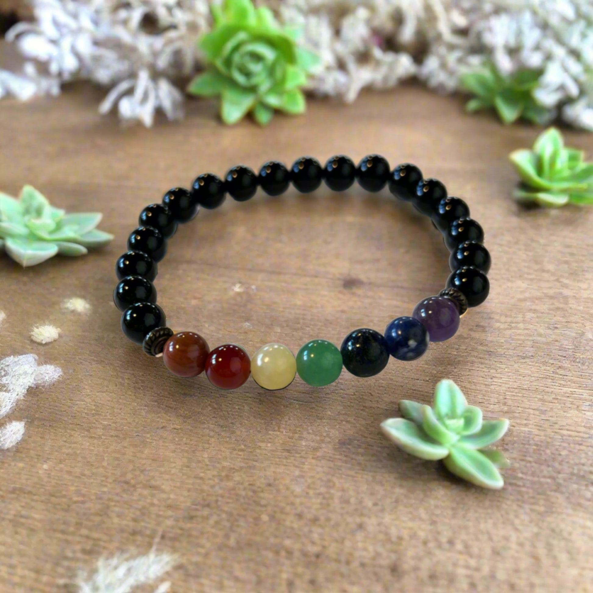 These 8-inch circumference beaded bracelets include stones to support each chakra: