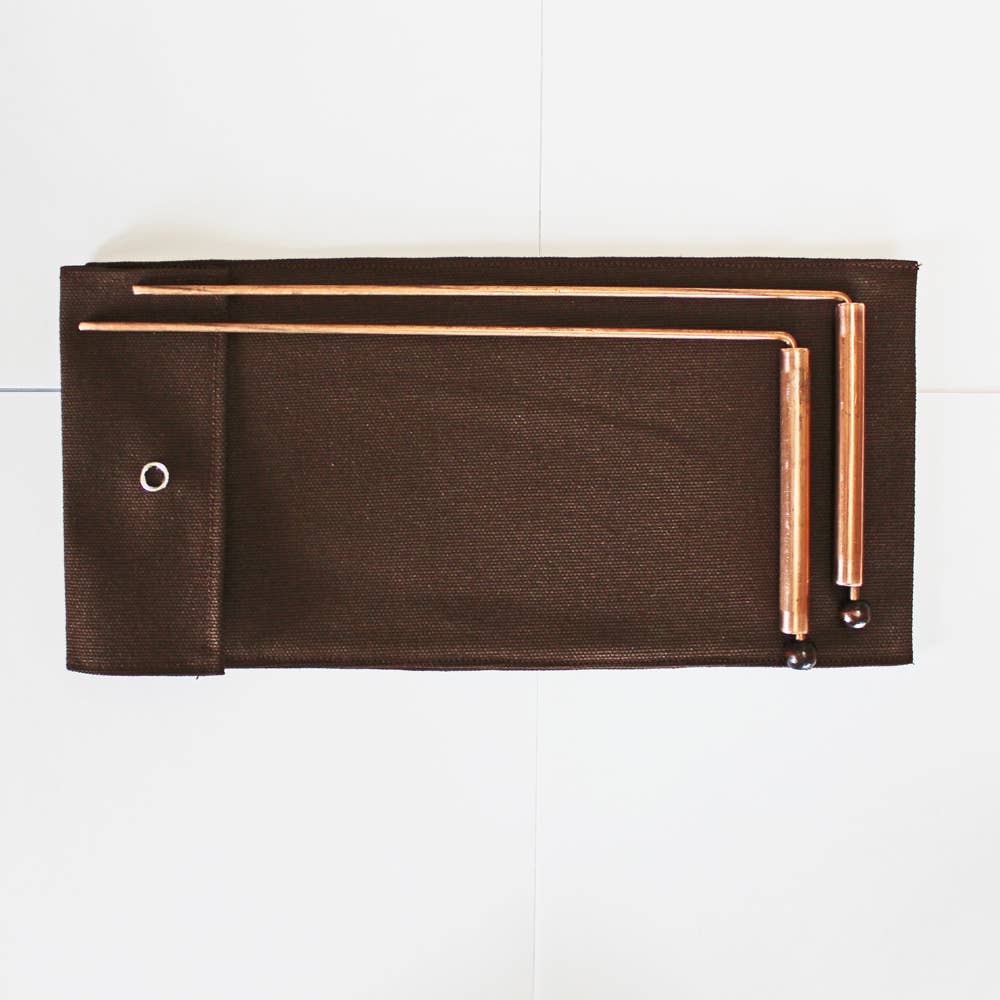 These copper dowsing rods come in a canvas bag for storage and an instruction booklet.
