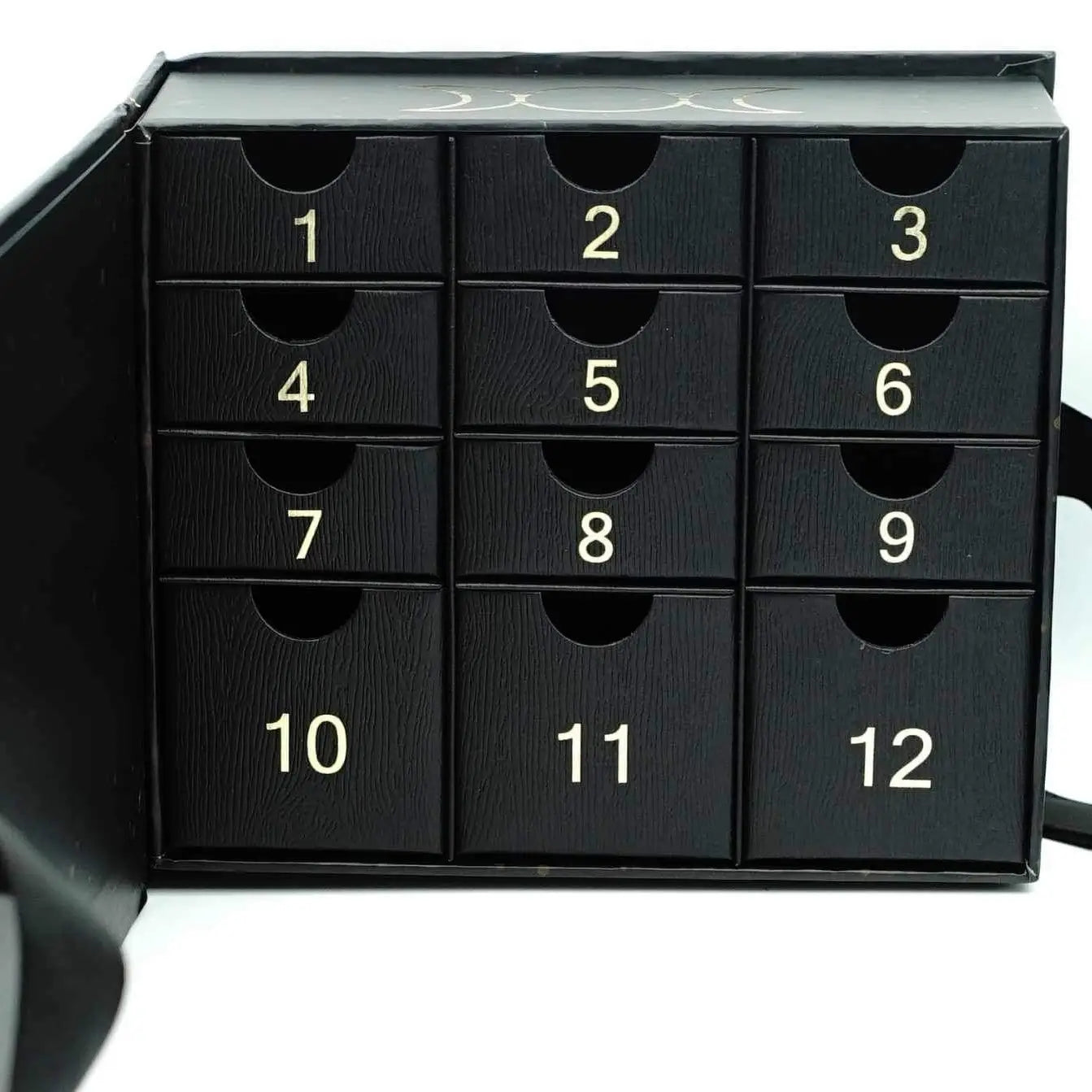 These beautiful, high-quality boxes are ready to be filled with whatever treats and surprises you want to add! There are 9 boxes that are 2" x 2" x 1", and there are 3 boxes that are 2" x 2" x 2". These black boxes with gold numbers and accents are 6.5" x 5.75" x 2.25". They are very sturdy, close with a black ribbon, and can fit an incredible amount of small objects! They are perfect for advent, solstice, or as a year-long journey for monthly gifts or ritual practices.