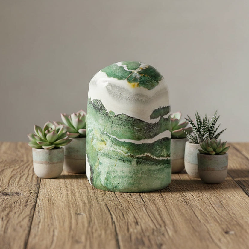 Green sardonyx attracts positive energy and good fortune, is protective, and supports strength, courage, motivation, willpower, discipline, and integrity. It can encourage motivation to actively and intentionally create a meaningful existence in this life. A powerful heart-supporting stone, it can attract new friends or romantic partners when one is ready for meaningful connection, and it can help to support healthy and happy partnerships. It helps us to stay grounded, confident, and hopeful. Green sardonyx helps give the strength and determination needed to accomplish goals. It helps one to see opportunities for prosperity and good luck in all areas of life. The stone has a natural, balancing energy that guides one to tune with one's surroundings and find a happy medium in one's life. It can help with new beginnings or creating new, healthier habits and behaviors. It can encourage blissful and restful sleep when placed near the head of the bed.