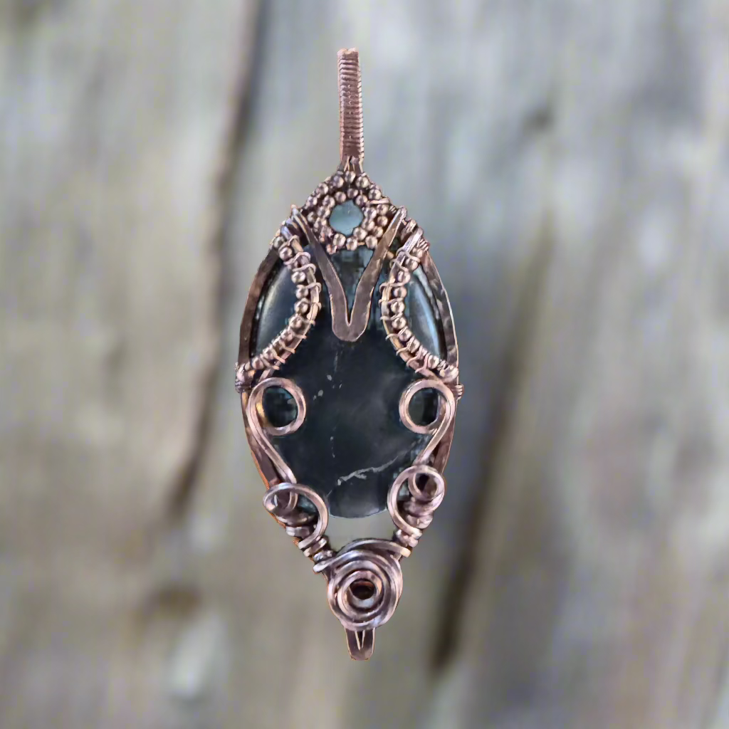 This beautiful one-of-a-kind pendant is handmade from high-quality copper wrapped around a shungite cabochon with pyrite inclusions.