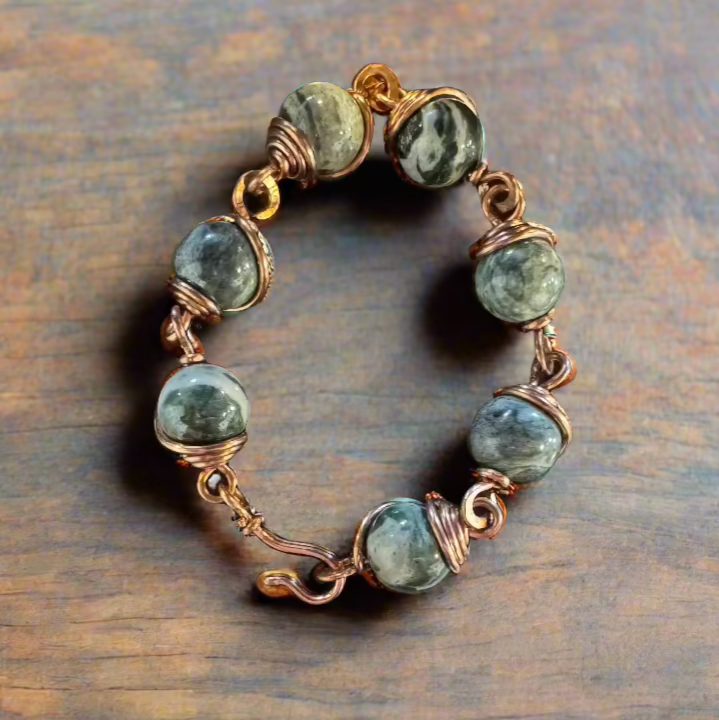 This beautiful bracelet is handmade from high-quality jade beads and copper. Jade is known to protect the wearer and absorb negative energy. It supports physical health and brings abundance, luck, and prosperity. Jadeite encourages creativity and supports spiritual growth by helping access meaning in dreams and helping connect to the spirit realm.