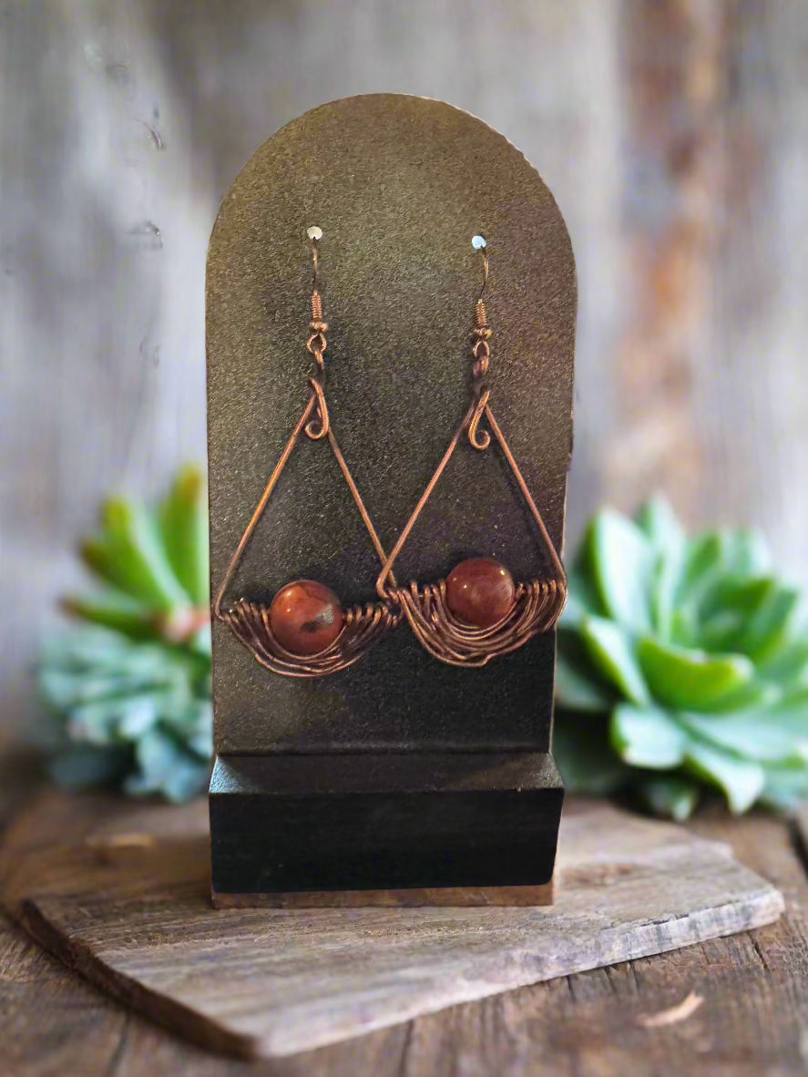 These beautiful one-of-a-kind earrings are handmade from high-quality red jasper and copper.