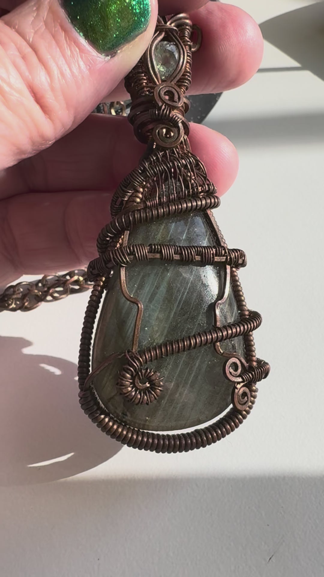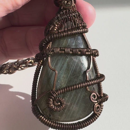 This beautiful, intricate pendant was handmade, wire-wrapped with copper around a flashy piece of labradorite. It comes with a copper chain. The photo doesn't do the flash justice--be sure to check out the video for a sense of the hidden flashy colors!