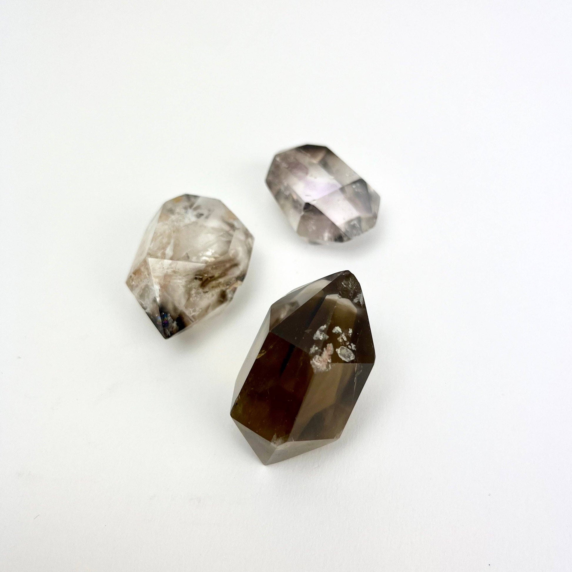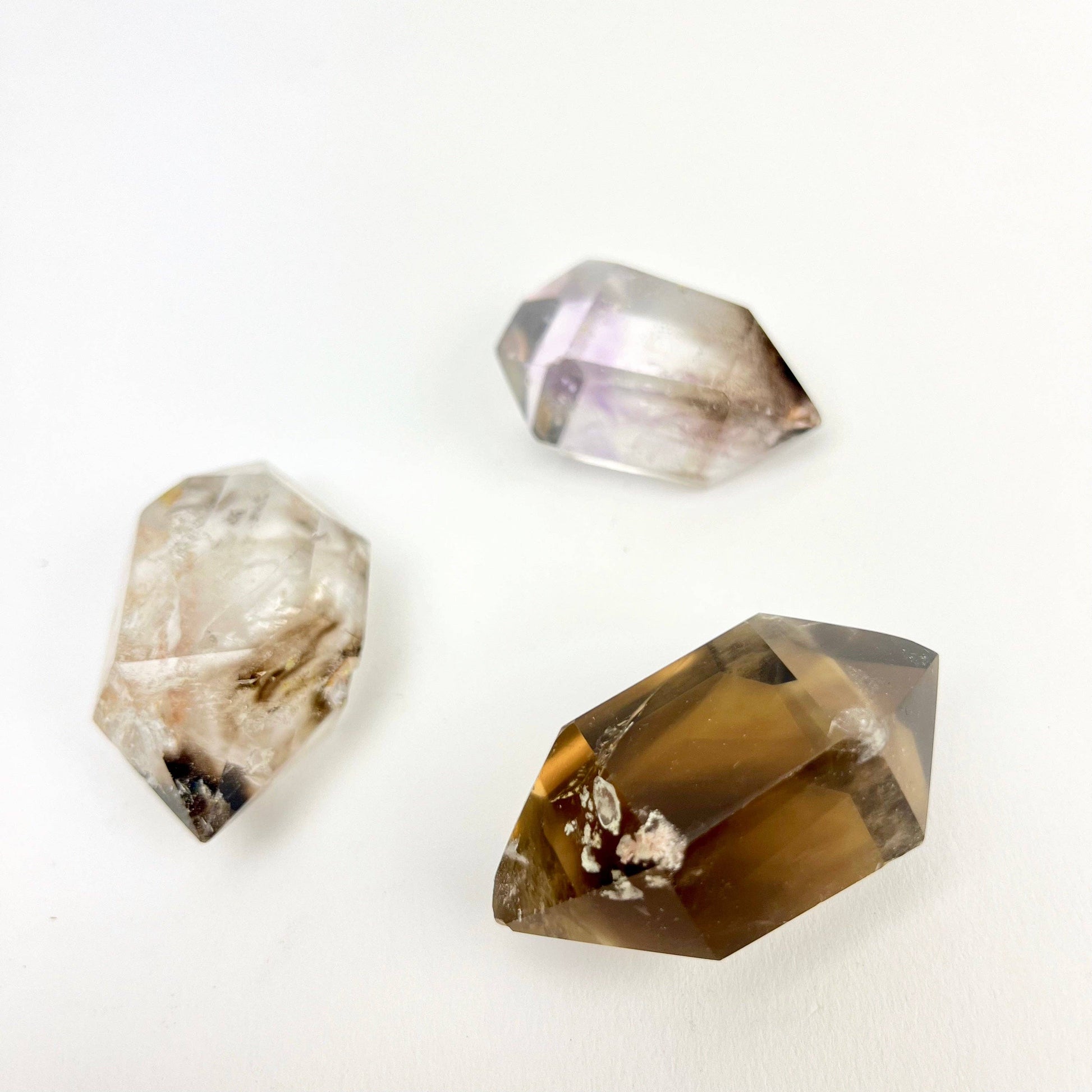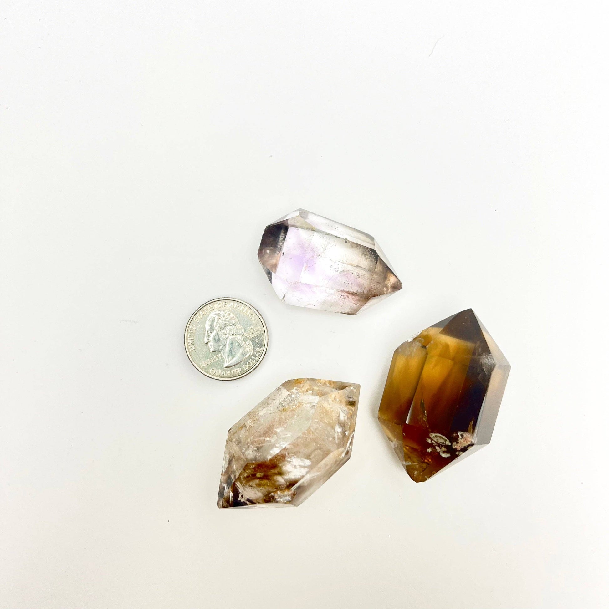 These beautiful double-terminated smoky quartz points from brazil have some amethyst, citrine, or phantom inclusions.