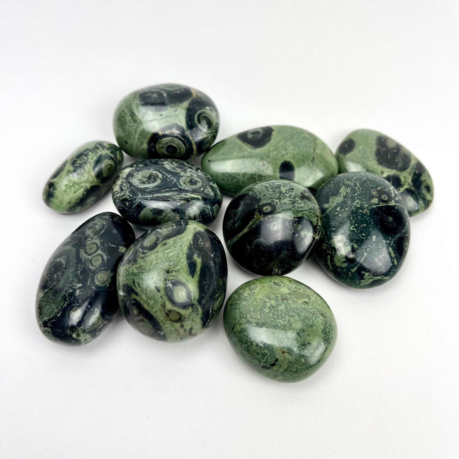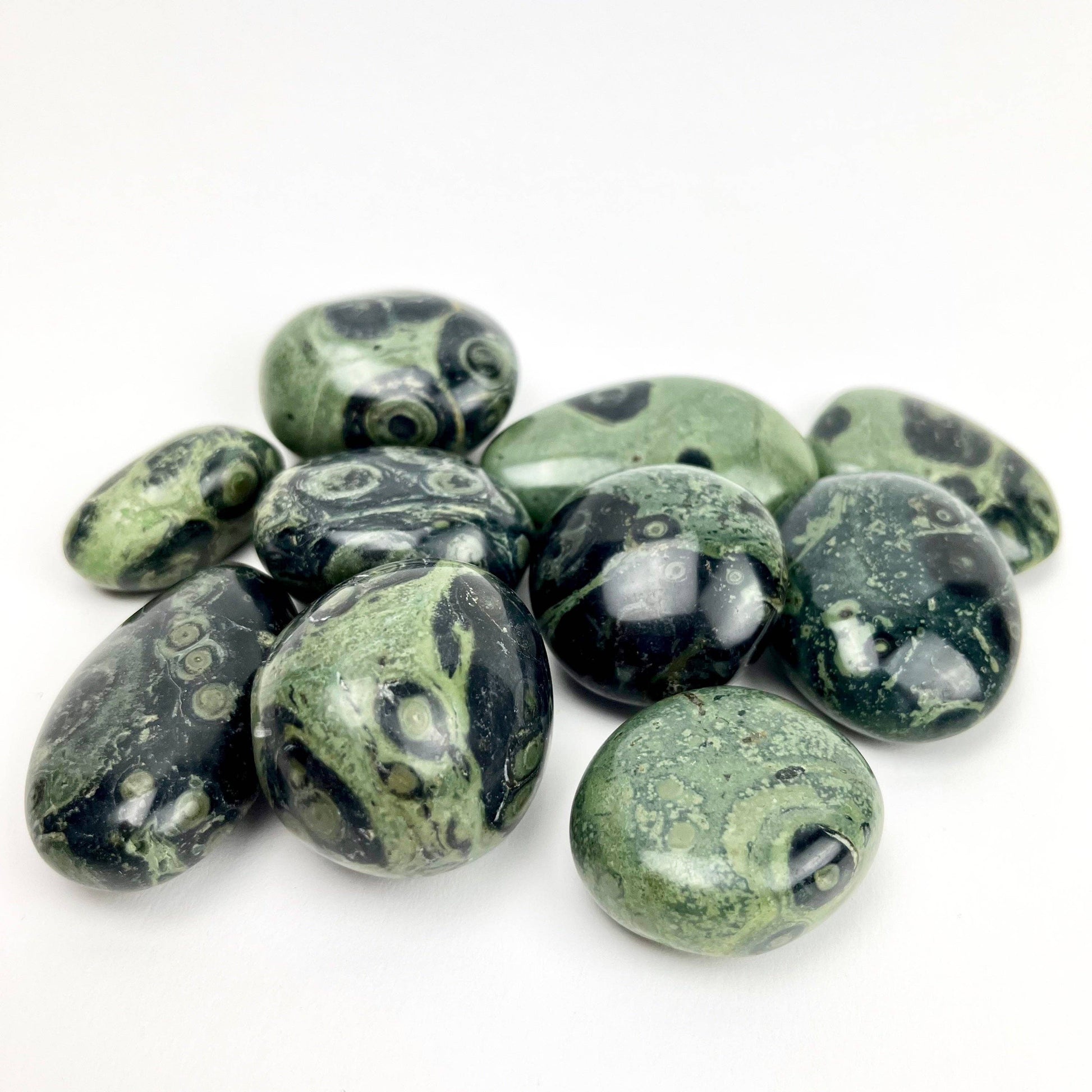 PROPERTIES:: Kambaba Jasper, also known as Green Stromatolite Jasper, is actually a fossil that dates back to 3 billion years ago. Kamaba Jasper is classified as a stromatolite, which refers to a prehistoric clump of algae and cyanobacteria that fossilized billions of years ago. Kambaba Jasper helps us to achieve emotional balance throughout the day, heals the heart and calms emotions like guilt, anger, and sadness. You can harness Kambaba Jasper’s special connection to Mother Nature by mediating with it outside.