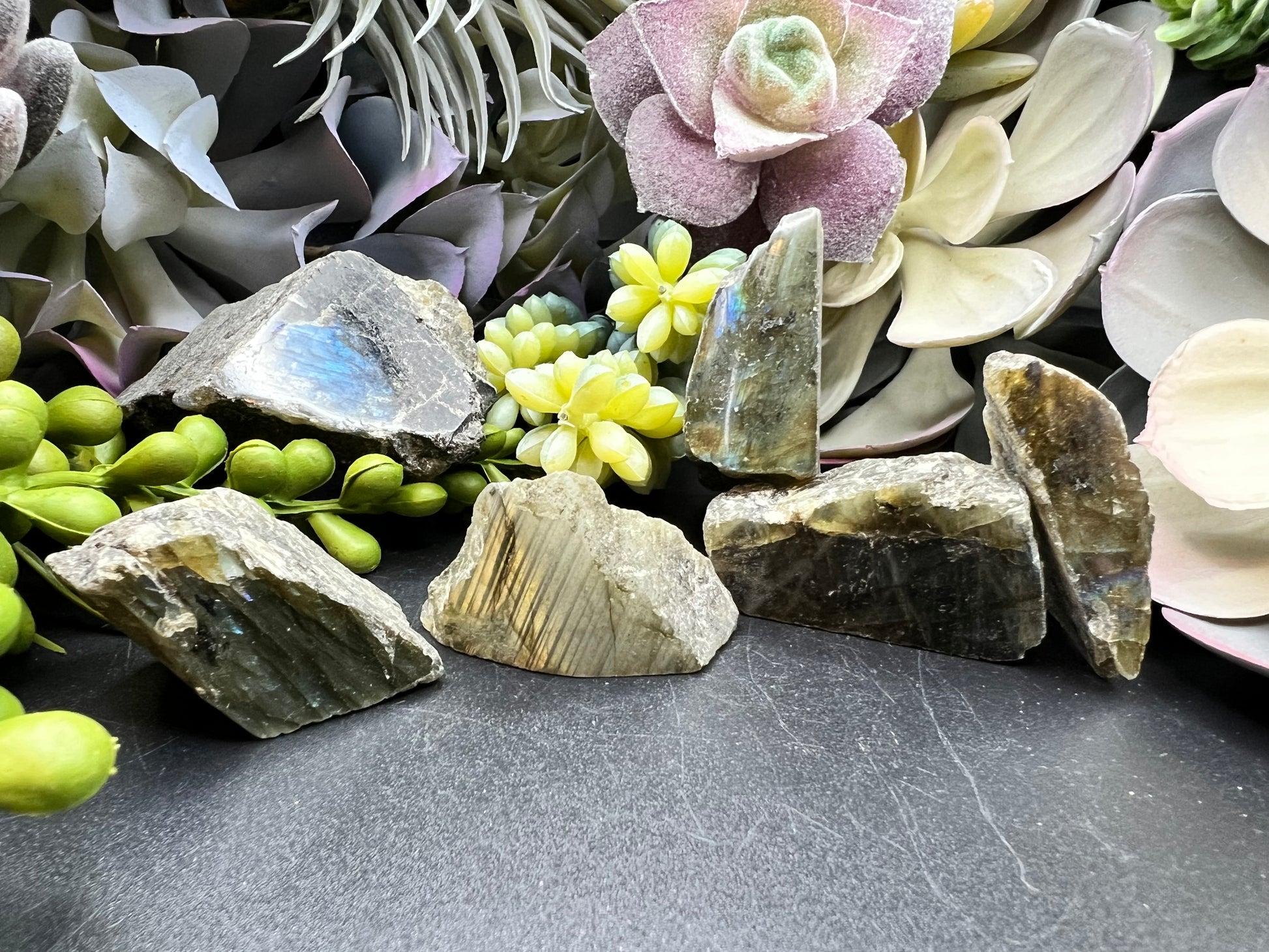 These chunks of raw labradorite have one polished face to allow their natural chatoyancy to come out.