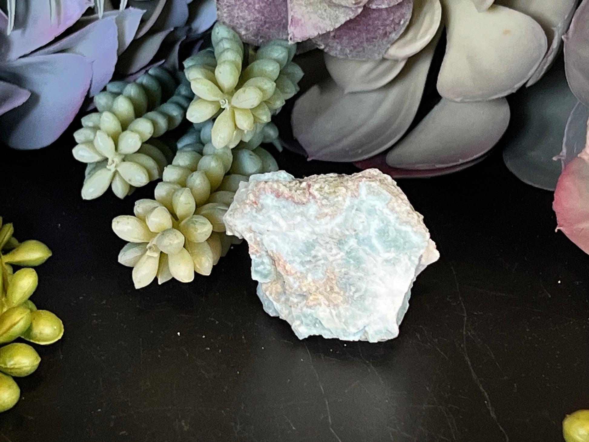 Larimar is a rare blue stone that comes from the Dominican Republic. It resembles the appearance of sunlight playing on water and embodies the cleansing calm of the ocean. It washes away anxious thoughts and clears your throat chakra to support self-expression and the embodiment of your true and authentic voice. It helps release self-sabotaging behaviors and thoughts while bringing courage.