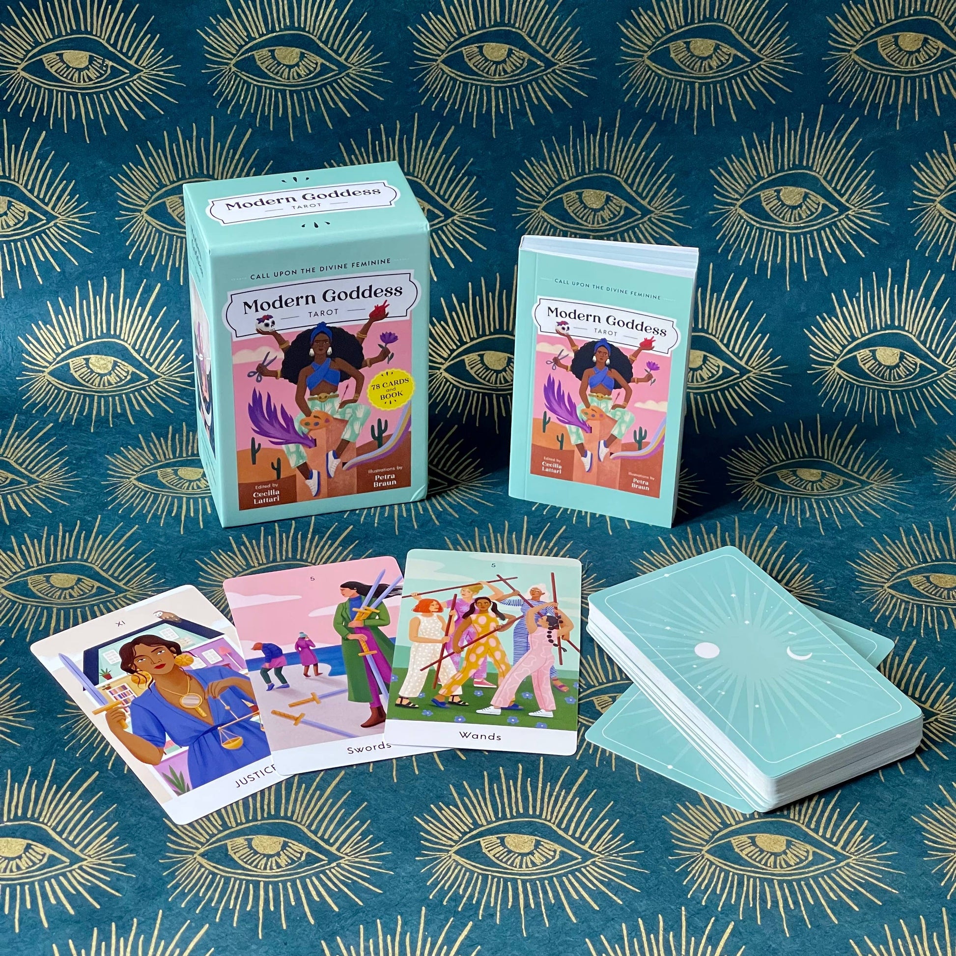 Every woman is a goddess imbued with the power of the Divine Feminine, realized through a lineage of famous females both historical and mythical. This gorgeous deck, stunningly illustrated by internationally famous artist Petra Braun, looks at the classic Rider-Waite tarot through the lens of these goddesses. Instead of the chaotic destructive force of The Tower, we have the beautiful and terrifying Hindu goddess Kali. Instead of The Empress, we have Hawaiian deity Pele, luxuriously clothed in flame. These boldly painted cards are an excellent way to call upon the goddesses when asking questions of yourself, your loved ones, and this world. Kit; 3.5 x 5.5 inches; 128 pages.