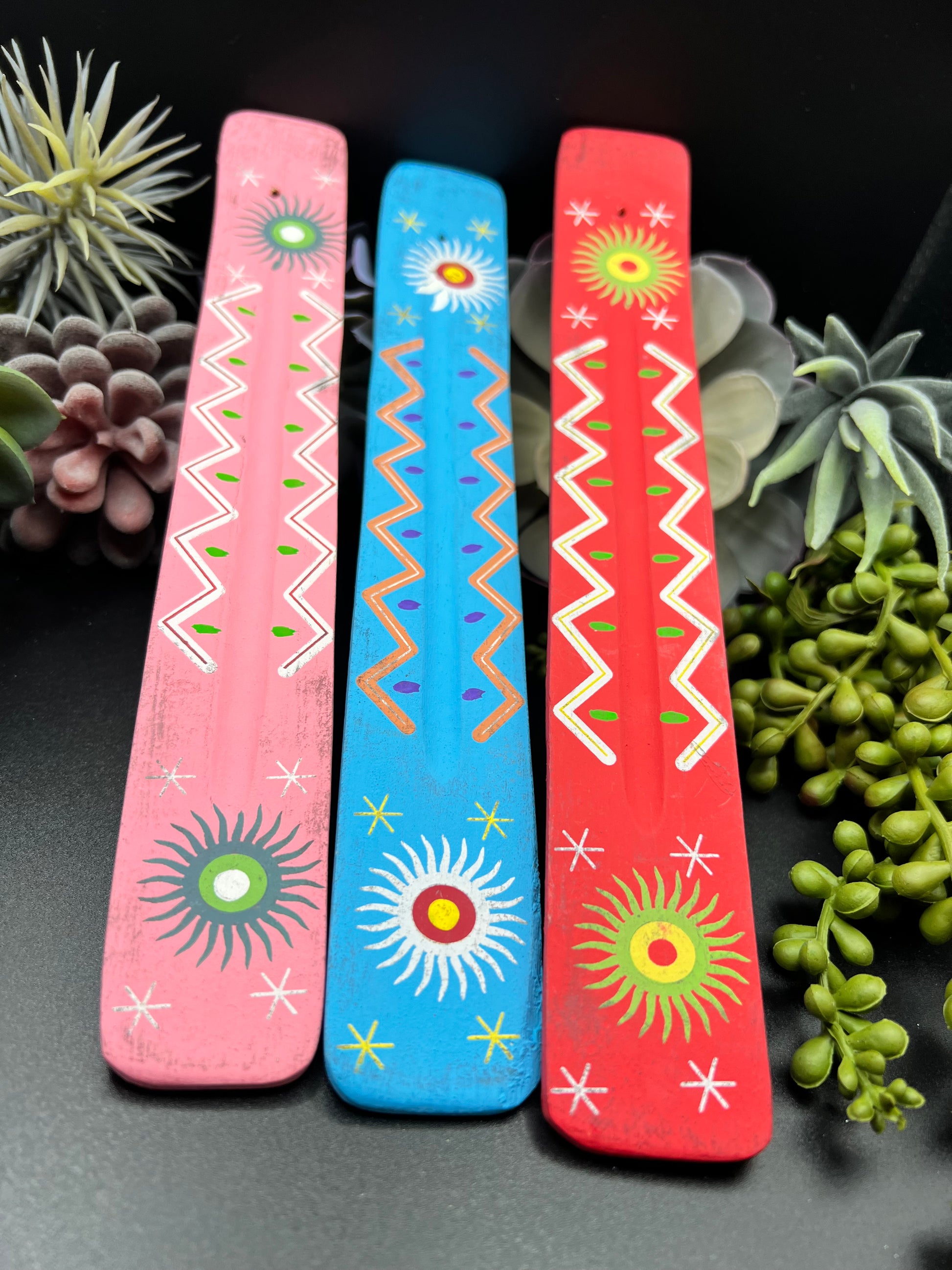 These hand-painted incense stick holders, made in India, come in multiple colors. You will receive a holder of our choosing unless you specify your color preference. The Om holders are in blue and pink; the sun holders are in blue, pink, and red.