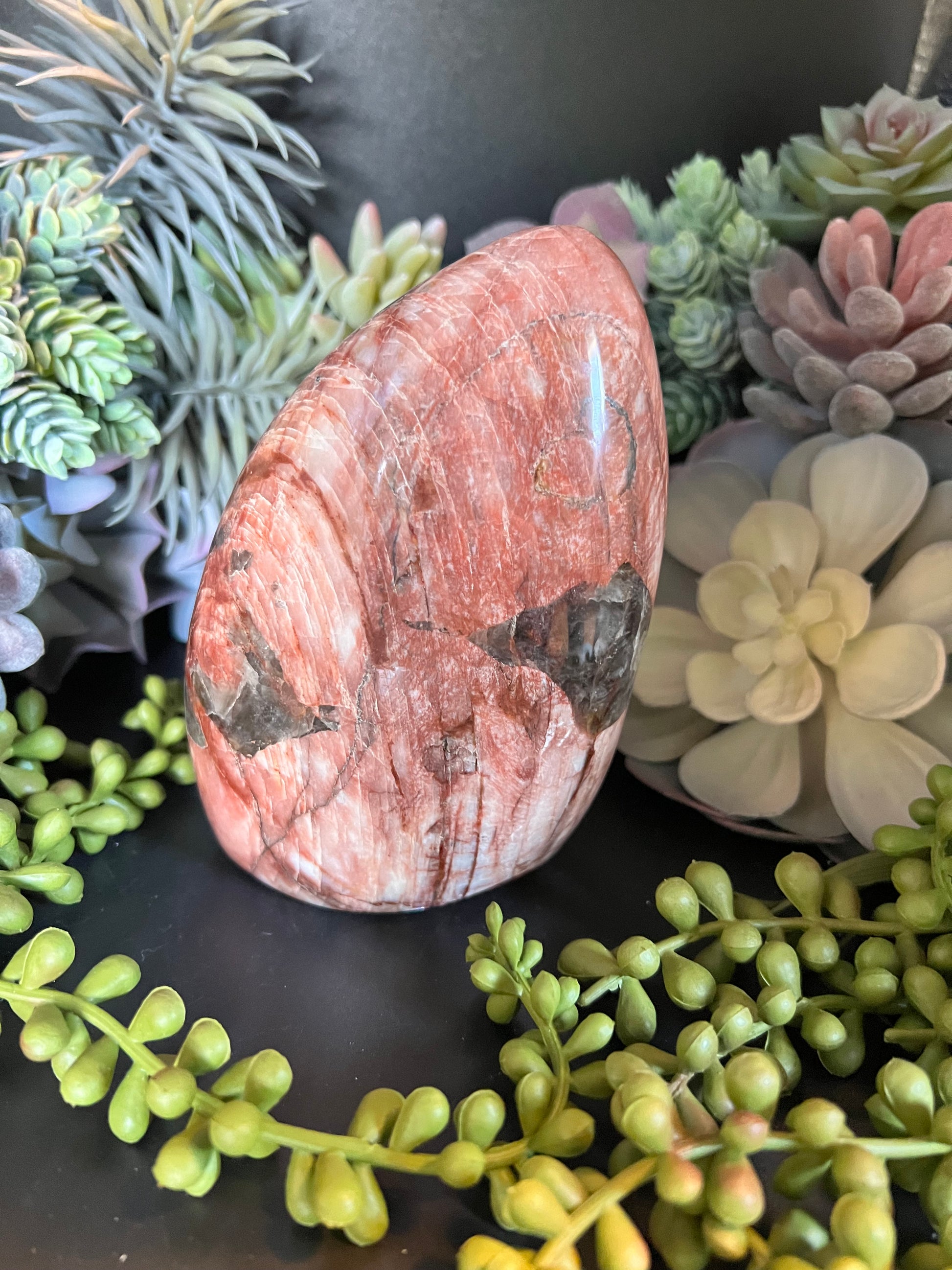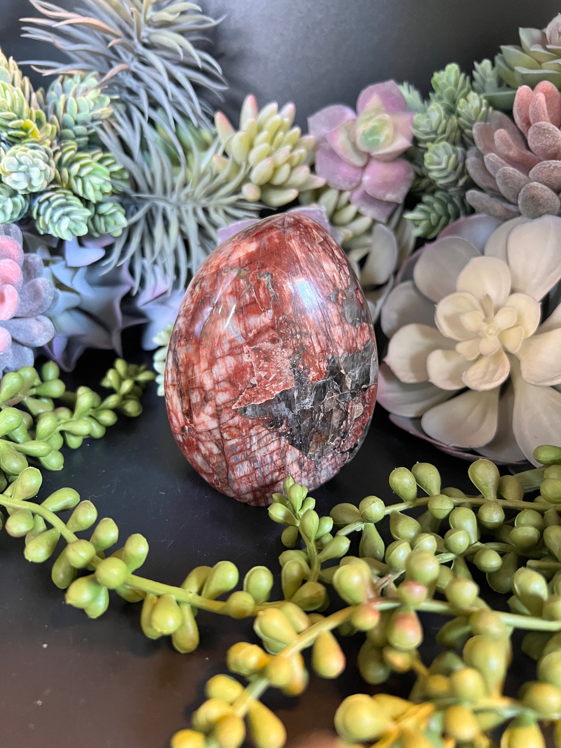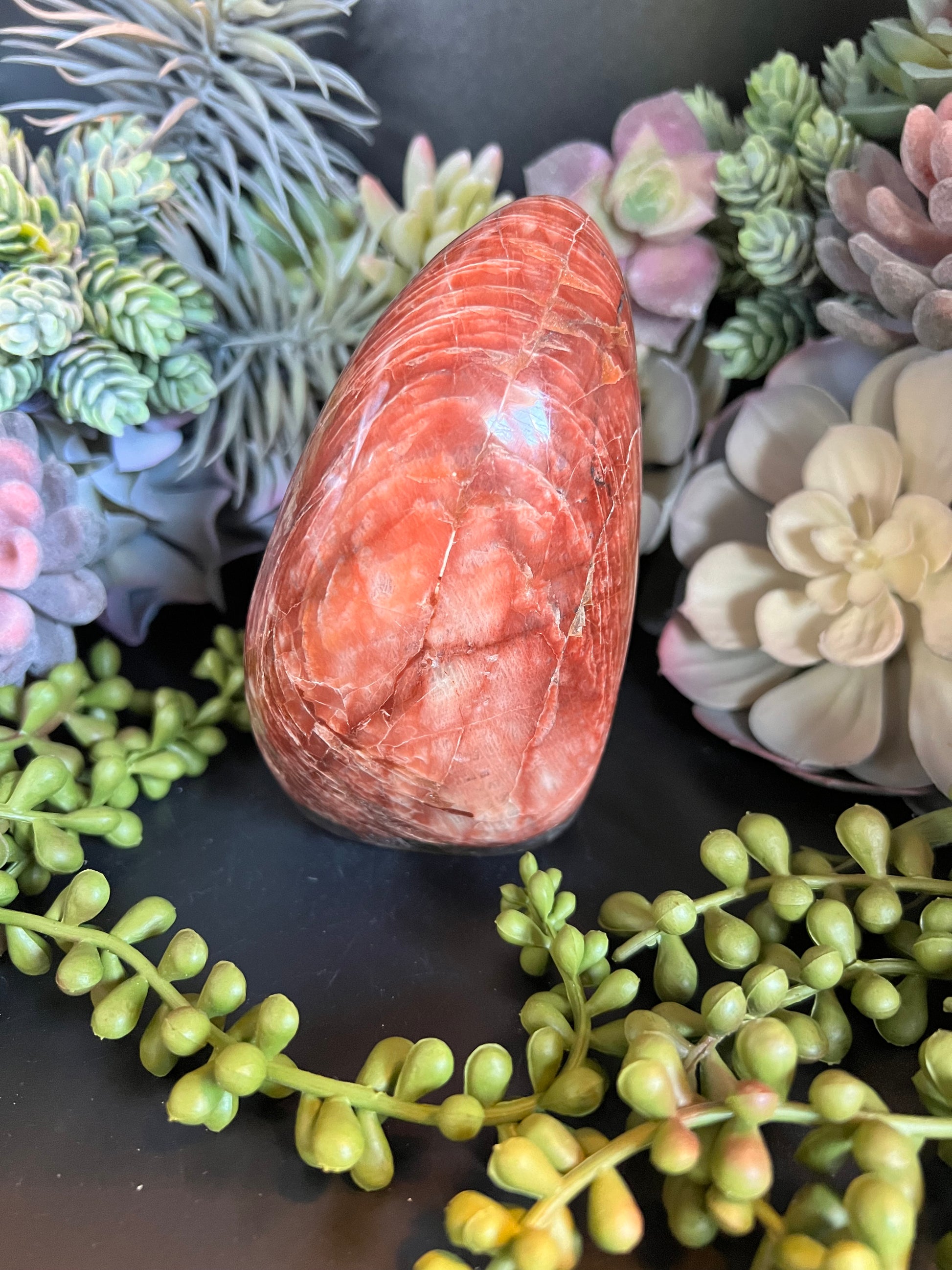 Moonstone is a stone of new beginnings that is connected to moon and intuition. It connects us to and balances our own inner cycles and encourages lucid dreaming. It supports empathy and calms reactions to emotional triggers, balancing male/female energies. The high iron content in red moonstone also makes it a deeply grounding stone.