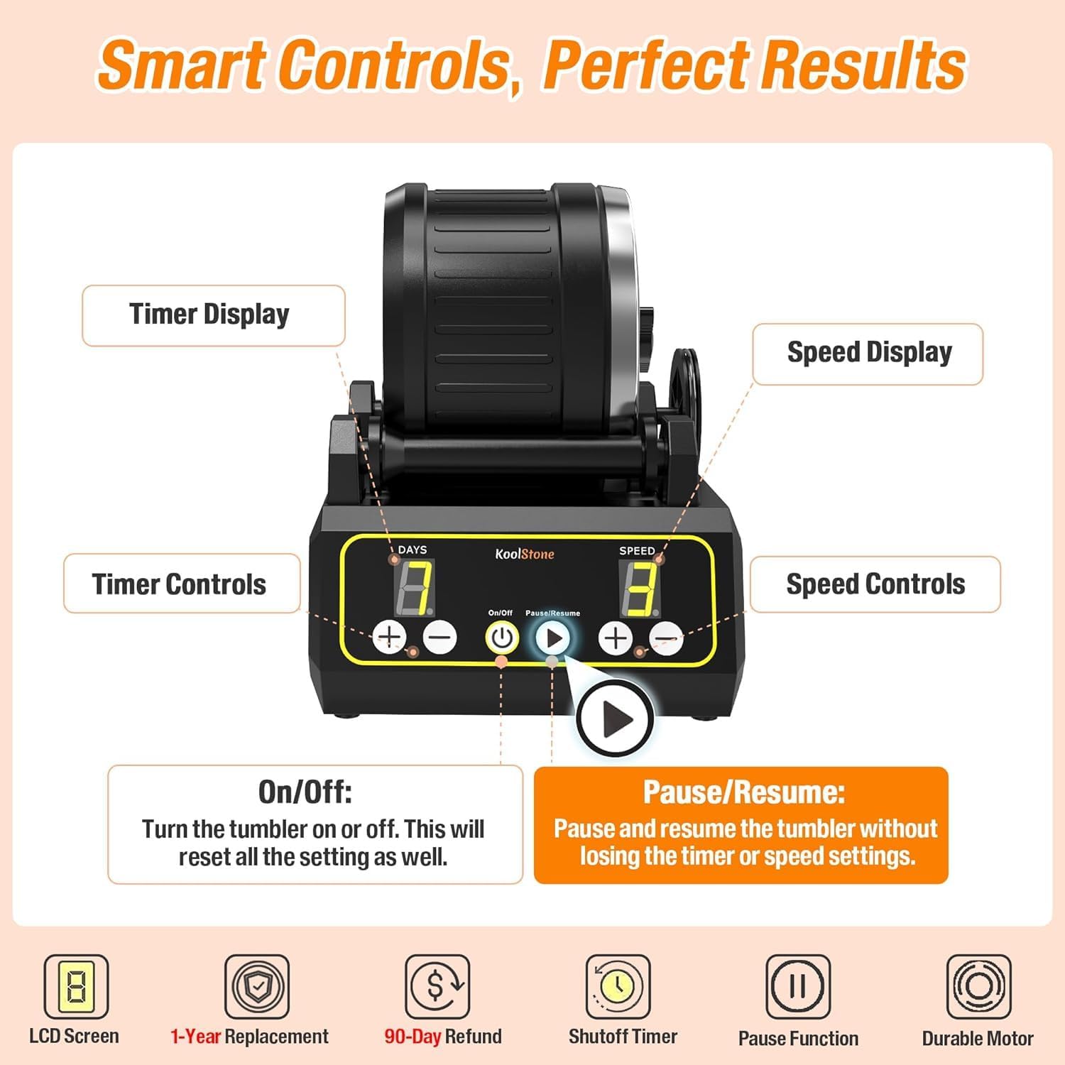 A 2.5-pound capacity allows you to tumble more stones at one time, and this model is 75% quieter than most because it has a rubber outer coating rather than a plain plastic barrel. It has 3 speed controls (providing more granular tumbling results) and a 9-day timer (with automatic shutoff feature and memory function), all displayed on clear screen, letting you easily hone your settings for precise tumbling each time.