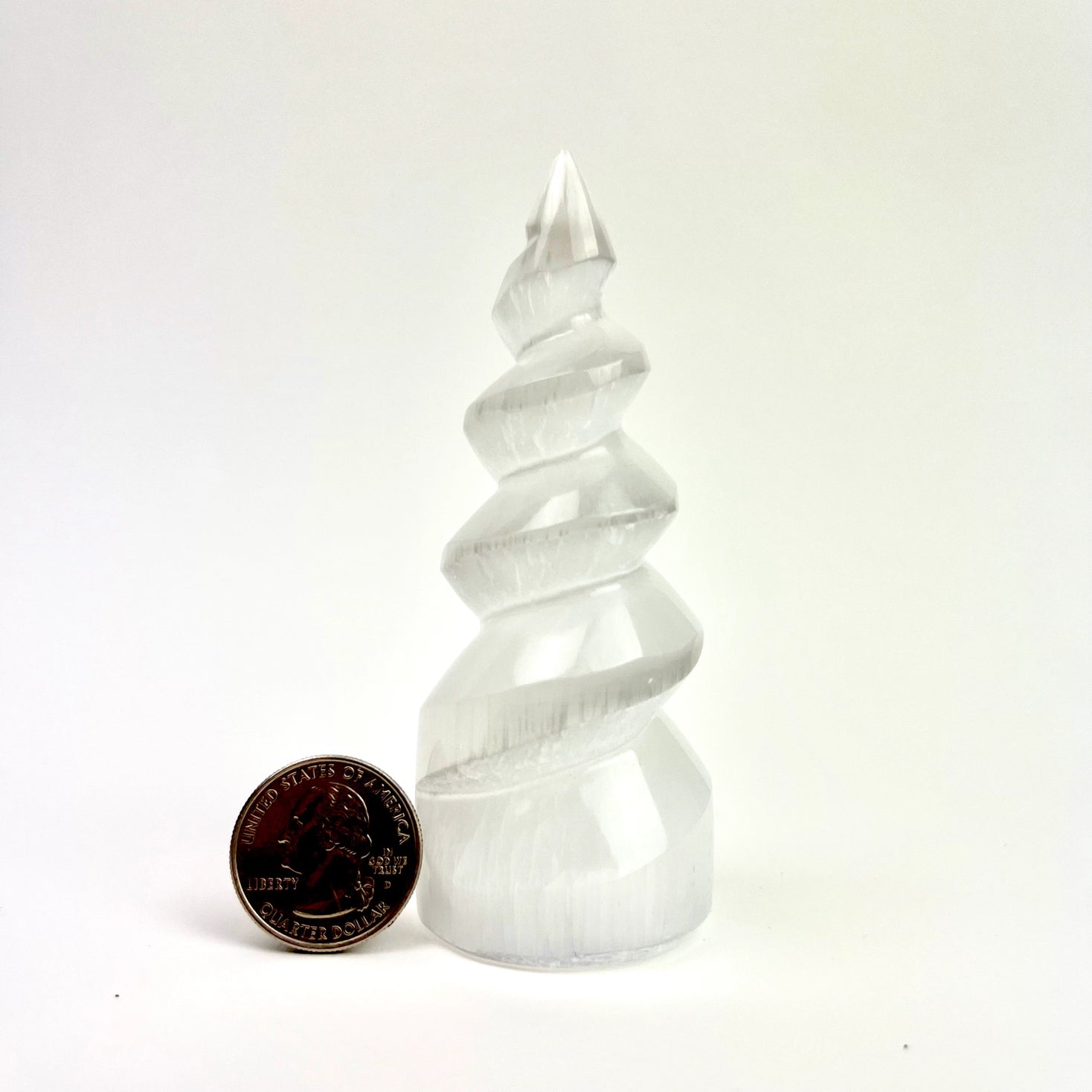 Selenite vibrates with the highest, purest energy of the spirit realm. Connected to the energy of the angels, selenite brings peace and calm to any space. It also never needs to be cleansed, so it can be used to clear other stones—we have special flat slabs, called charging pads, for this purpose, which allow you to place stones directly onto the selenite to be cleared overnight. Selenite clears blocked energy, provides clarity, and helps to connect the user to their intuition.