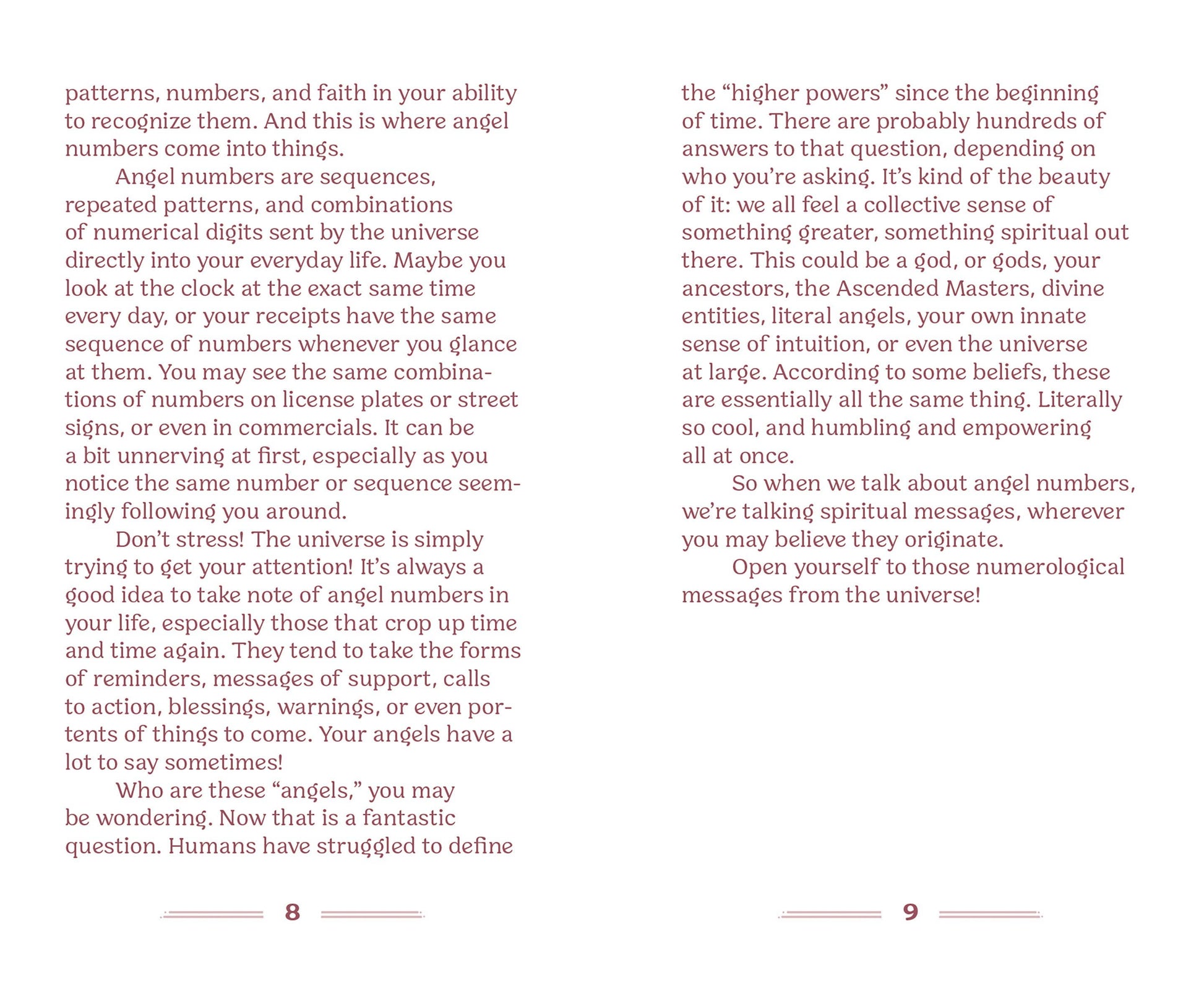Angel numbers are repeated numerical sequences that are said to be messages from the universe. If 11:11 appears on the clock, is printed on a receipt, or materializes as if by magic on a nearby street sign, it may be a higher power predicting that exciting things are on the way. If you see the number 777, it could be the universe with a message to take it easy and rest a bit. 888? Whatever is happening, it's the right path to follow! This bright, easy-to-use oracle deck channels the energy of such angel numbers so that anyone can use their power to bring amazing synchronicity and good fortune into their lives. Created and designed by the popular Pulp Girls duo, this deck will have a contemporary look and hit just right with the same spiritual seekers who are among their 1 million fans on Instagram. Card Deck; 3 7/8 x 5 3/8 inches; 128 pages.
