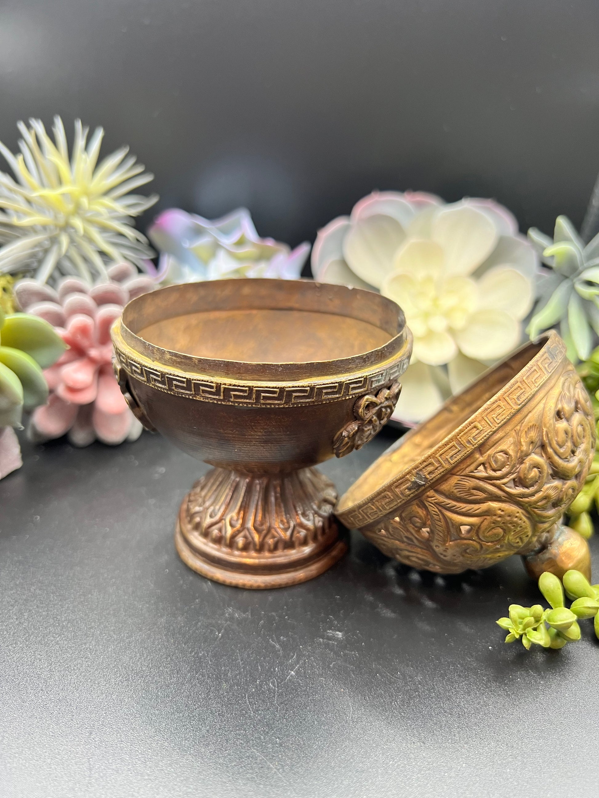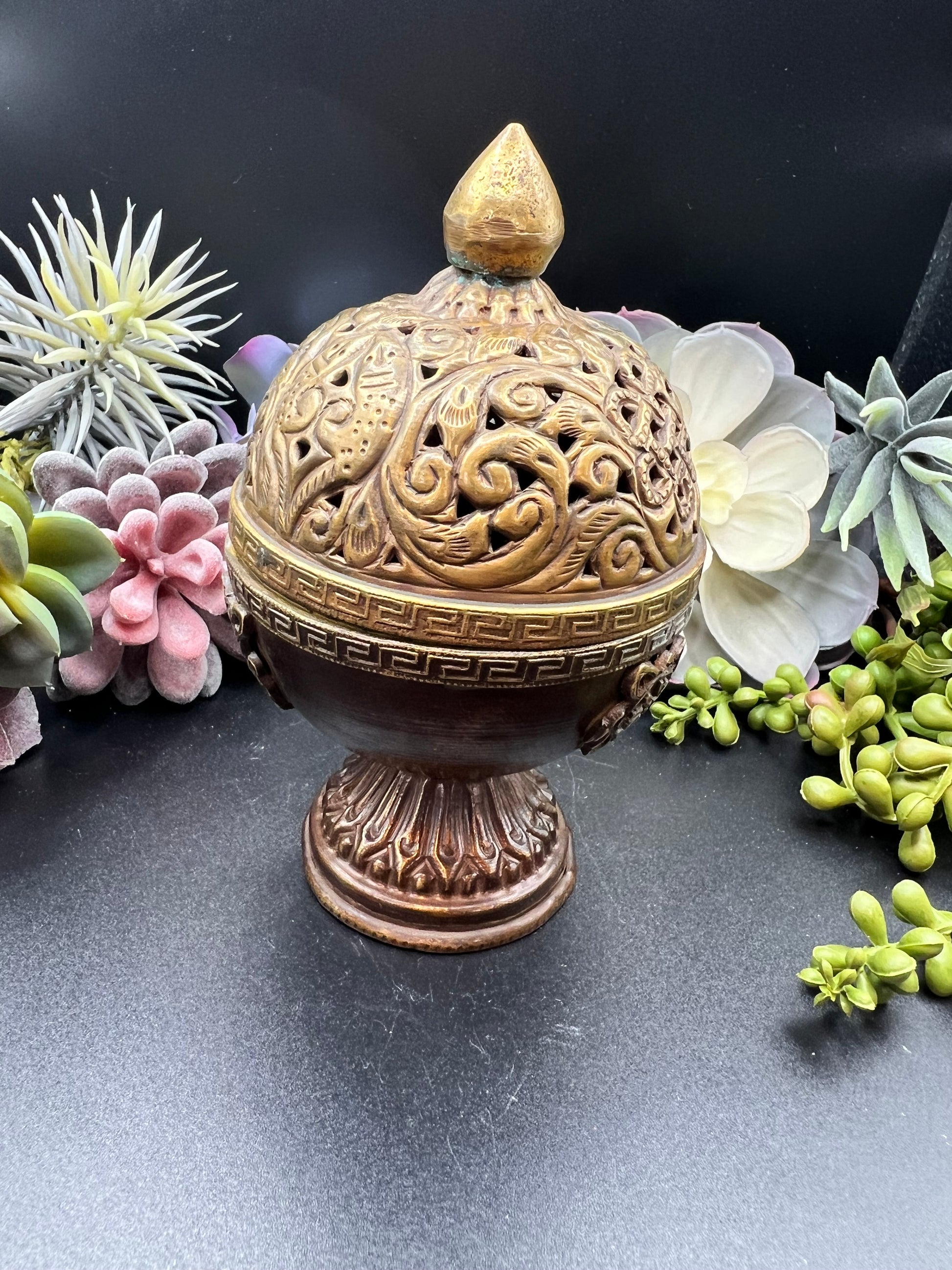 This brass incense burner is styled like a censer: ball-shaped with holes that allow the incense inside to burn.