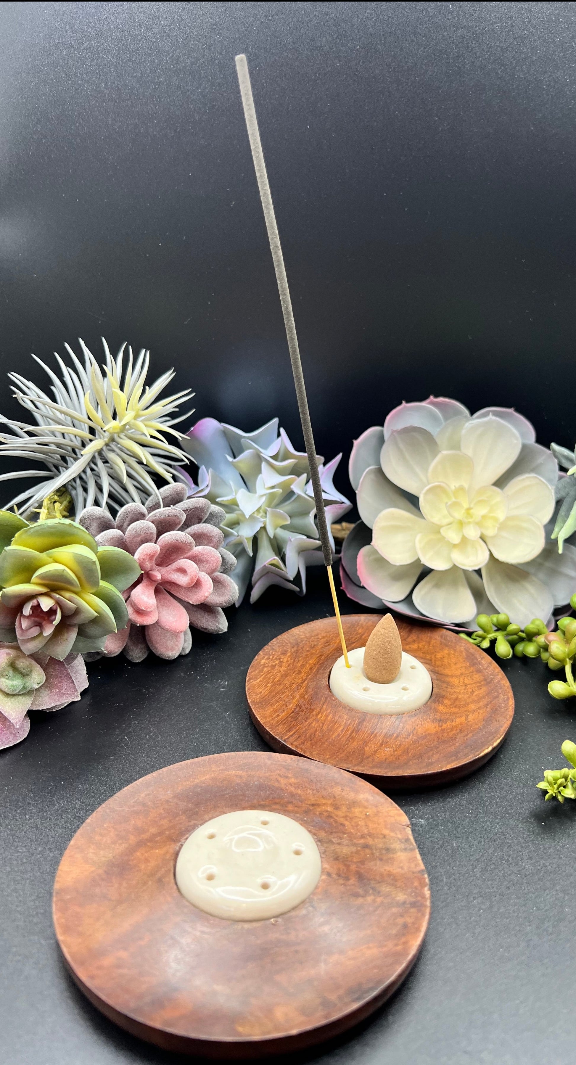 These sturdy wooden discs with soapstone inlaid into the center have spaces for burning both incense cones and incense sticks.